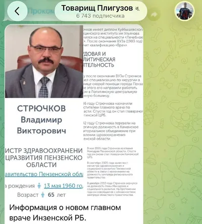 Бывшего главу Минздрава Пензенской области сватают в кресло главврача сельской больницы Уролог Инзенской РБ, блогер Сергей Плигузов утверждает, что Владимир Стрючков прибыл в медучреждение ознакомит