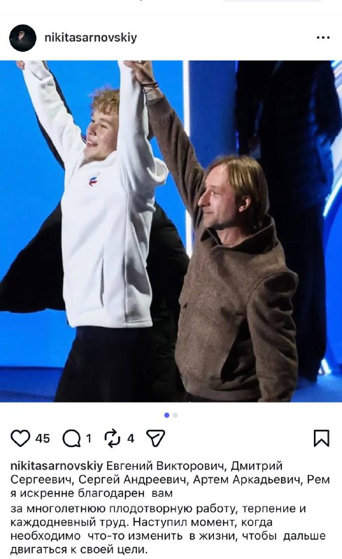 Никита Сарновский объявил об уходе от Евгения Плющенко. Неожиданно! Но символично, что уходит победителем - чуть больше месяца назад стал чемпионом России по прыжкам.