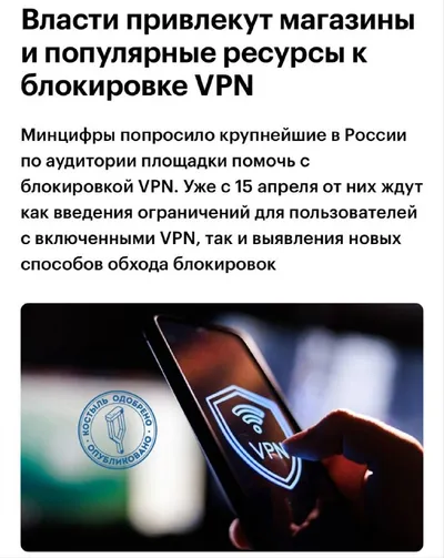 ⚡К 15 апреля крупные сайты в России начнут ограничивать пользователей с VPN. Минцифры попросило площадки внедрить механизмы блокировки трафика. Исключение сделают только для «белых» корпоративных сер