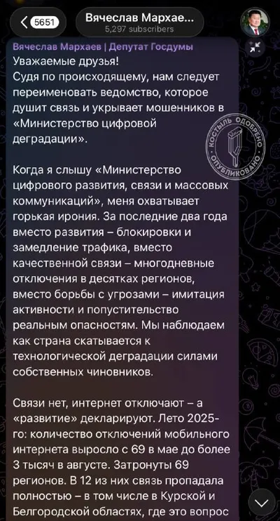 Госдума ополчилась на Минцифры: депутаты резко раскритиковали ограничения интернета и предложили переименовать ведомство в «министерство деградации». Депутат Вячеслав Мархаев заявил, что вместо разви