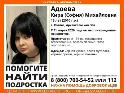 ‼️ В Котласе третий день ищут школьницу 31 марта Кира Адоева ушла в школу на улице Герцена и не вернулась. С тех пор её ищут круглосуточно. Школьница была одета в чёрную куртку, чёрные широкие штаны