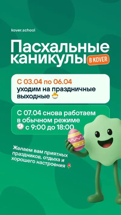 📢 Пасхальные каникулы в KOVER С 03.04 по 06.04 школа на праздничных выходных 🐣 С 07.04 возвращаемся к работе в обычном режиме 🕘 с 9:00 до 18:00 Желаем вам приятных праздников, отдыха и хорошего