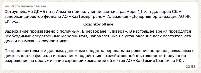 В @Koza4kov_BOT пишут со вчерашнего вечера, что в Алматы задержан топ-менеджер дочерней компании КТЖ при получении миллиона долларов. Эти деньги, по сведениям источникам, переданы за лоббирование инт