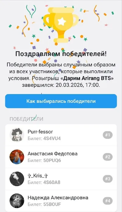 🖤Поздравляем победителей Розыгрыша альбомов Arirang 🎉🎉🎉 Благодарим всех за участие!🫰🫶 С завтрашнего дня открываются продажи на альбомы ➡️Arirang с картами Lucky draw