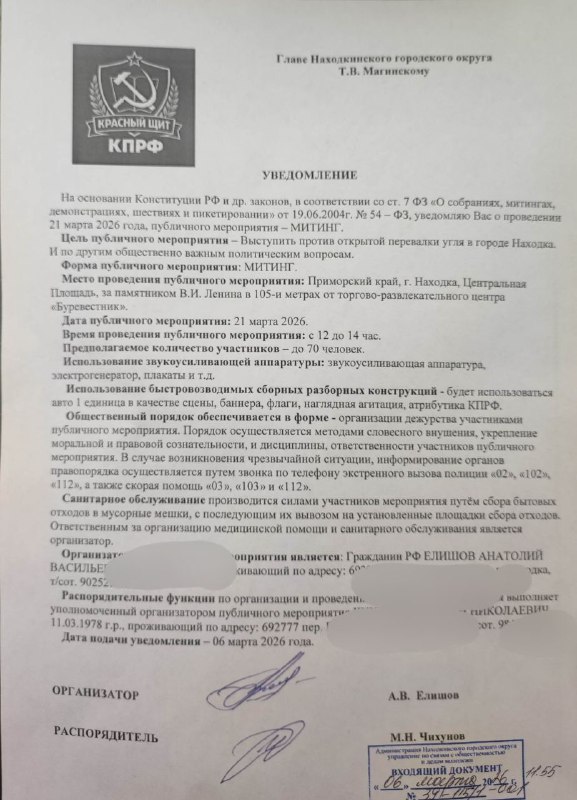 ⚡️ Жители Находки дадут "бой" стивидорам. 21 марта коммунисты портового города намереваются собраться на протест против открытой перевалки угля и угольной пыли 🛠