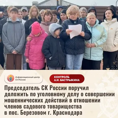 Председатель СК России поручил доложить по уголовному делу о совершении мошеннических действий в отношении членов садового товарищества в пос. Березовом г. Краснодара В социальной сети размещено виде