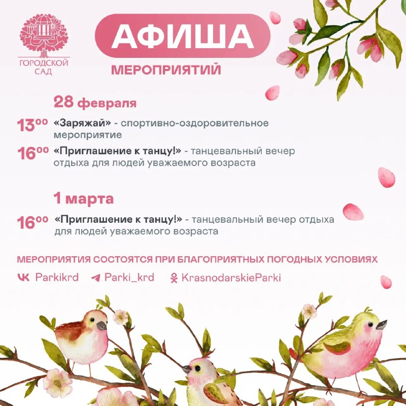 Программа мероприятий в парках ⏰28 февраля и 1 марта (сегодня и завтра) 📍Городской сад; Чистяковская роща; Солнечный остров; парк им. 30-летия Победы В программе: 🔹Спортивный заряд: утренние разми