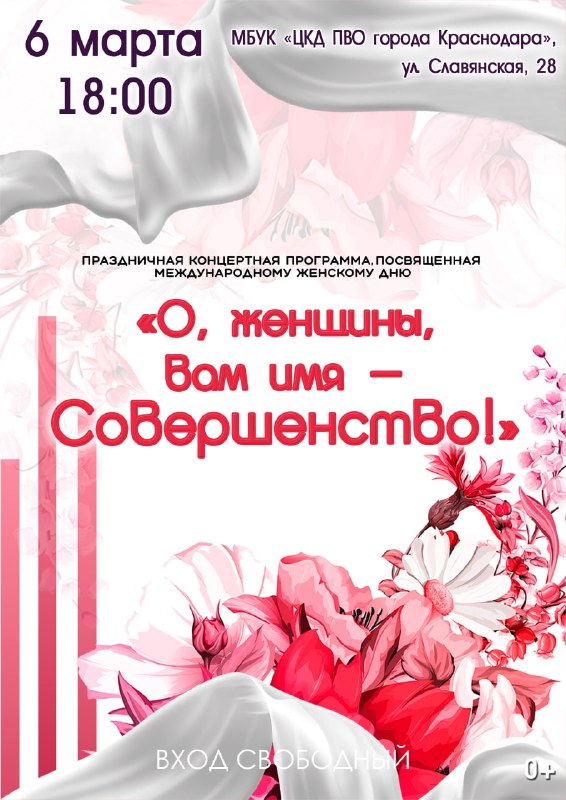Праздничный концерт «О, женщины, вам имя - Совершенство!» ⏰6 марта (пт), в 18:00 📍ЦКД ПВО города Краснодара, ул. Славянская, 28 💵Вход свободный В программе вечера: 🔹Выставка рисунков и работ деко
