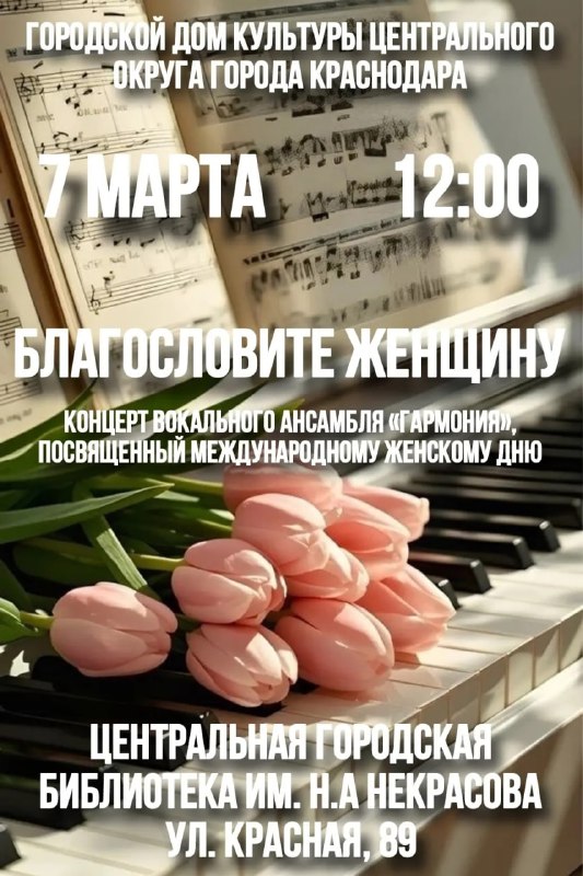 Концерт Вокального ансамбля «Гармония», посвященный Международному женскому дню ⏰7 марта (сб), в 12:00 📍Центральная городская библиотека им. Н.А. Некрасова, ул. Красная, 89 💵Вход свободный Гостей