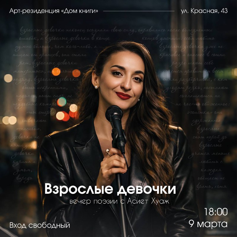 Творческий вечер с честным названием «Взрослые девочки» 🖤 Для вас будет читать актриса театра и кино Асиет Хуаж. 🎧 В программе: поэты Серебряного века и современные авторы. Нам особенно интересн