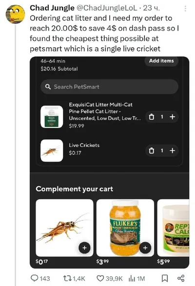 Чувак добавил в заказ живого сверчка за $0.17, чтобы сэкономить $4 на доставке. Нужно было добить корзину до $20 ради скидки, и он нашёл самый дешёвый товар во всём магазине. Итоговый заказ: наполните