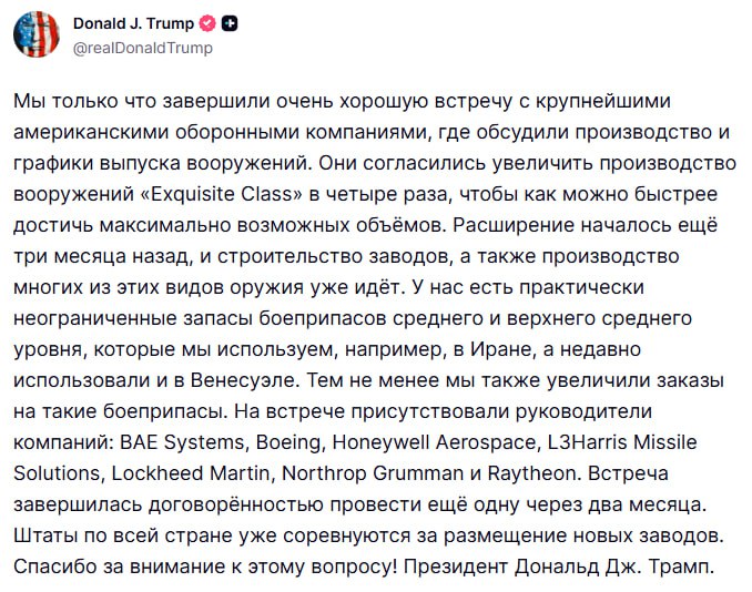 ⚡️Президент Трамп сообщил, что ведущие оборонные компании США разработали стратегию, ориентированную на увеличение производства оружия в четыре раза. Он также отметил, что оборонная промышленность в