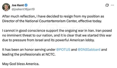 ❗️Глава контртеррористического центра США Джо Кент ушёл в отставку из-за несогласия с военной операцией против Ирана В своих соцсетях он написал, что страна начала конфликт под давлением Израиля и ег