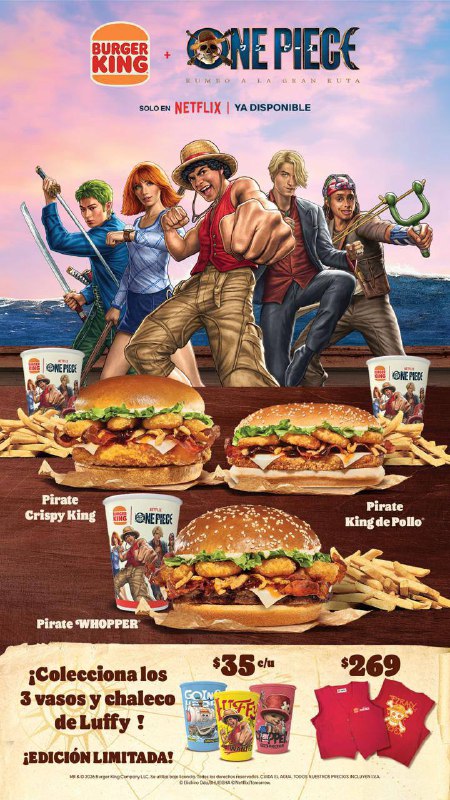 🤔 Мексиканский Burger King сделает коллабу с One Piece в честь выхода 2 сезона. В рамках сотрудничества выйдут 3 тематических бургера в фирменной пиратской упаковке с соломой, а также коллекционные