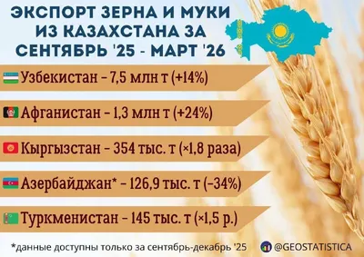 📊 Экспорт зерна и муки из Казахстана в зерновом эквиваленте достиг 8,9 млн тонн Это на 1 млн тонн больше по сравнению с аналогичным периодом прошлого года (7,9 млн тонн). Основным импортером по-прежн