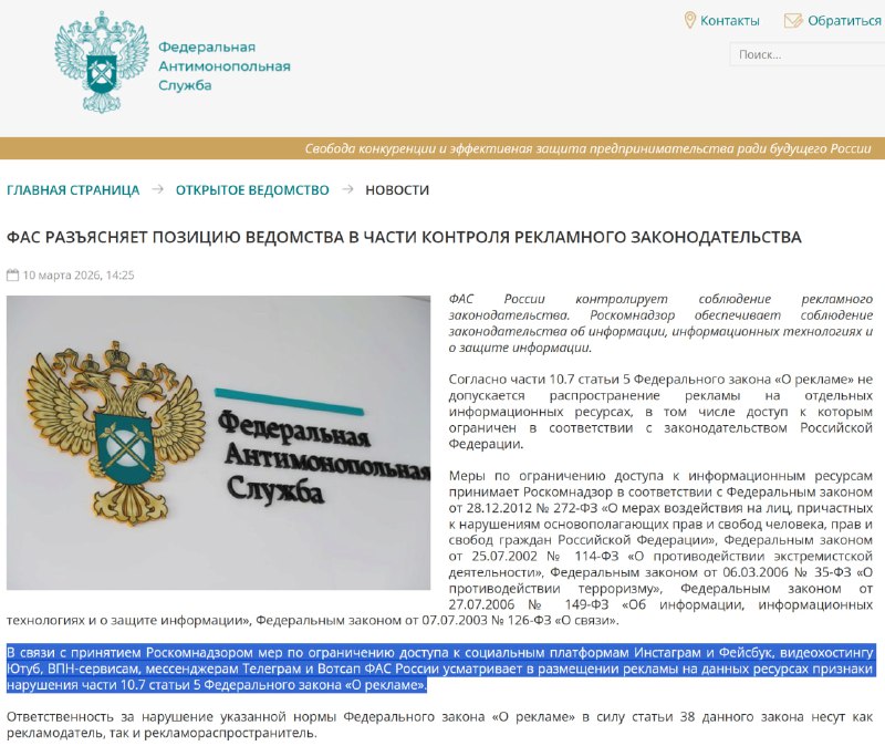 Ну что, помните что я писал? Хочешь убить телегу - запрети рекламу. Вот и ответочка от ФАС, на новости о штрафах блогерам. Читаем: В связи с принятием Роскомнадзором мер по ограничению доступа к соц