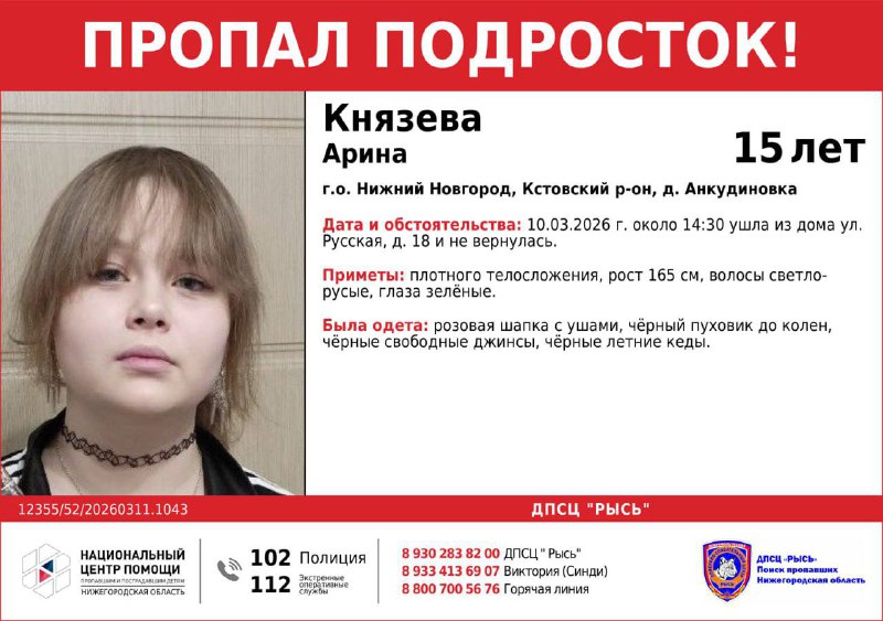 ⚡️ Пропал подросток! Помогите, пожалуйста, распространить информацию! Князева Арина, 2011 г.р., Кстовский р-он, д. Анкудиновка Кстово в Макс 🇷🇺 💬 Предложить новость 🔴Подписаться на Кстово
