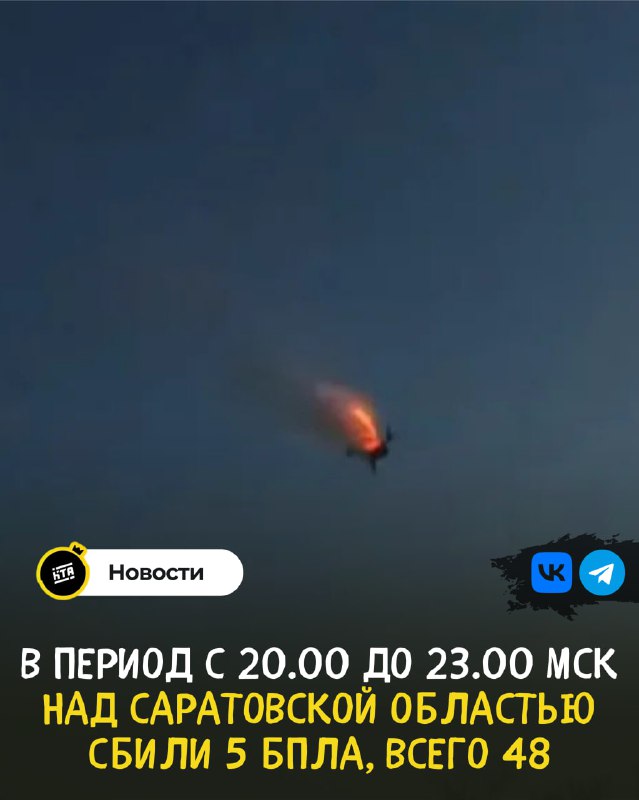 ‼️В период с 20.00 до 23.00 мск над Саратовской областью сбили 5 БПЛА, всего 48 ▫️ 15 – над акваторией Черного моря, ▫️ 11 – над территорией Ростовской области, ▫️ 7 – над территорией Республики Крым