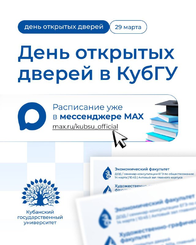 ⚡️ День открытых дверей в Кубанском Деканы факультетов, директор института, заведующие кафедрами и ведущие преподаватели расскажут о вузе, проведут презентации более 100 направлений подготовки бака