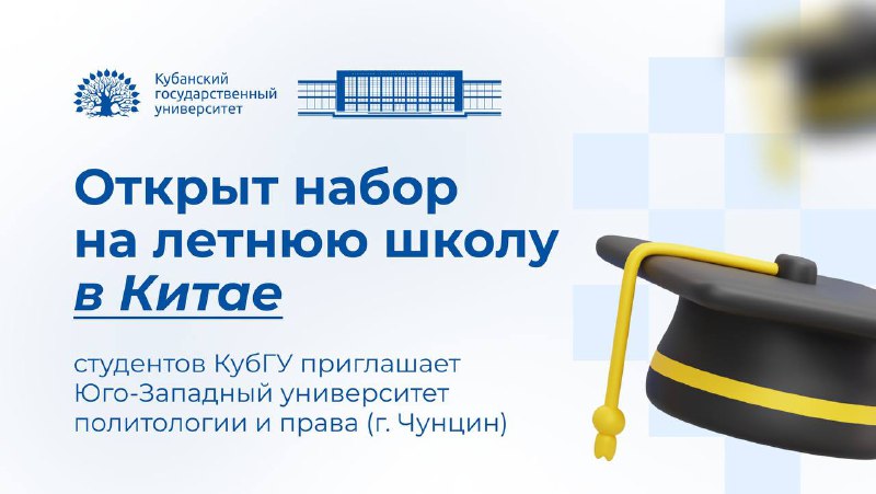 🇨🇳 Летняя школа в Китае Открыт набор на летнюю школу в Китае: студентов КубГУ приглашает Юго-Западный университет политологии и права (г. Чунцин). Ключевые детали программы: • Даты проведения: