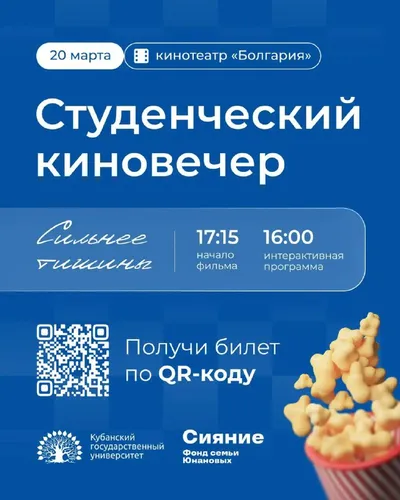 🎬 Погрузись в атмосферу кино 20 марта в кинотеатре «Болгария» пройдет специальный кинопоказ для студентов КубГУ — «Сильнее тишины». Окунись в атмосферное студенческое мероприятие с интерактивами,