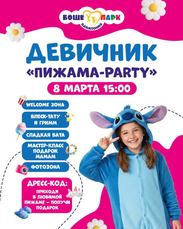 Бесплатный праздник на 8 марта 8 марта в Боше-Парке @bosheparkrostov — девичник Пижама Пати! Начало в 15:00 Что будет?👇 Ведущий в образе Стича, велком зона, блеск-тату и грим, фотозона, мастер-клас