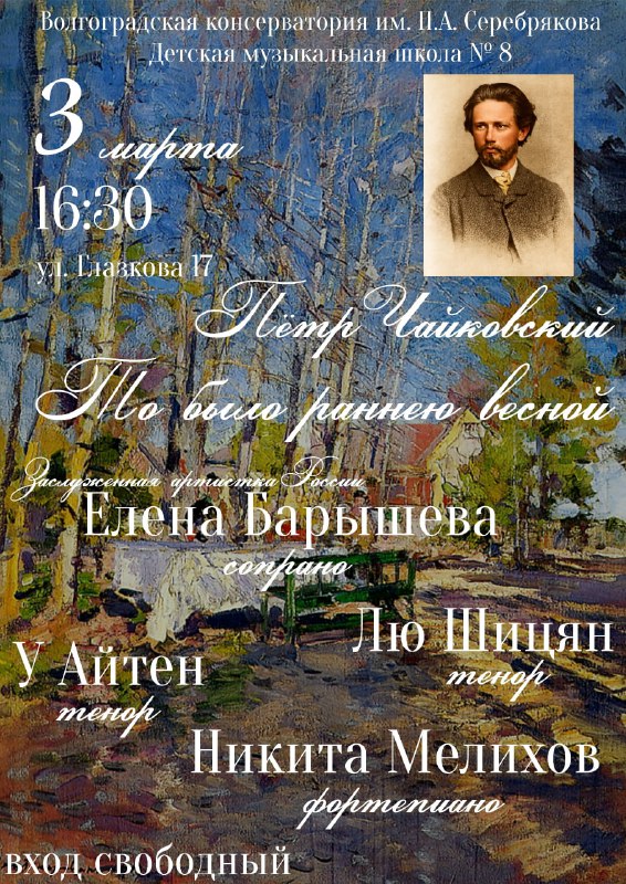 Концерт камерно-вокальной и фортепианной музыки ⏰3 марта (вт), в 16:30 📍Концертный зал ДМШ № 8, ул. Глазкова, 17 💵Вход свободный (при входе в школу необходимо будет предъявить документ, удостоверя