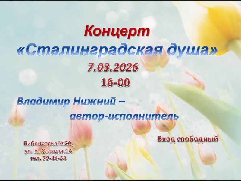 Концерт авторской песни «Сталинградская душа» ⏰7 марта (сб), в 16:00 📍Библиотека-филиал №20, микрорайон Спартановка, ул. им. Николая Отрады, 1А 💵Вход свободный Выступает Владимир Нижний, автор-исп