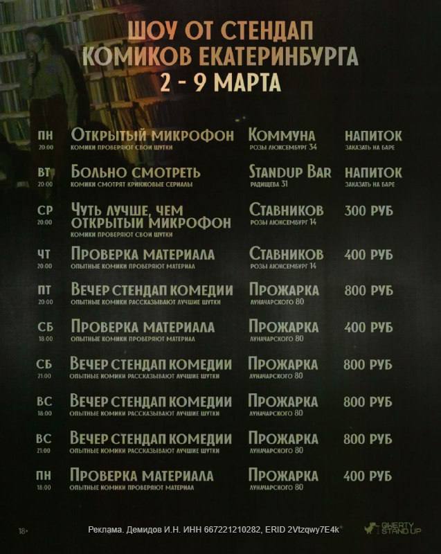 Шоу от стендап комиков Екатеринбурга на неделе (18+): 🎫Билеты по ссылке Понедельник (2.03) - Открытый микрофон Опытные и начинающие комики проверят свои шутки. ⏰20:00 (сбор 19:30) 🏠Коммуна (Розы Л