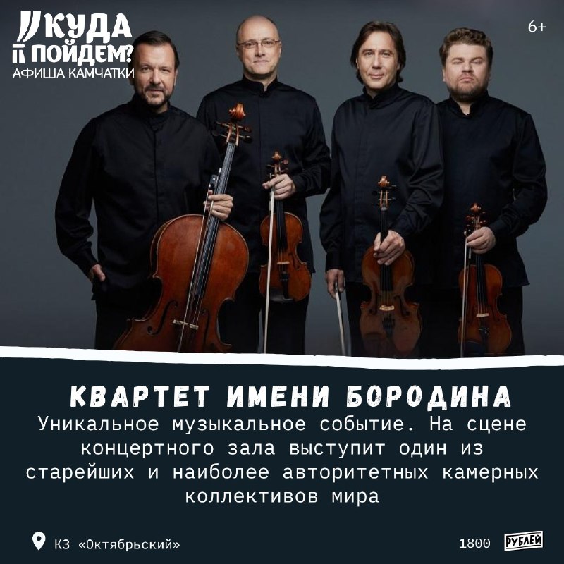 🎼Что для любителей классической музыки? #11апреля Куда пойдём? Афиша Камчатки сообщает о выступлении квартета имени Бородина (6+) Суббота, 11 апреля в 18:00 КЗ «Октябрьский» (Советская, 35) 1800 р