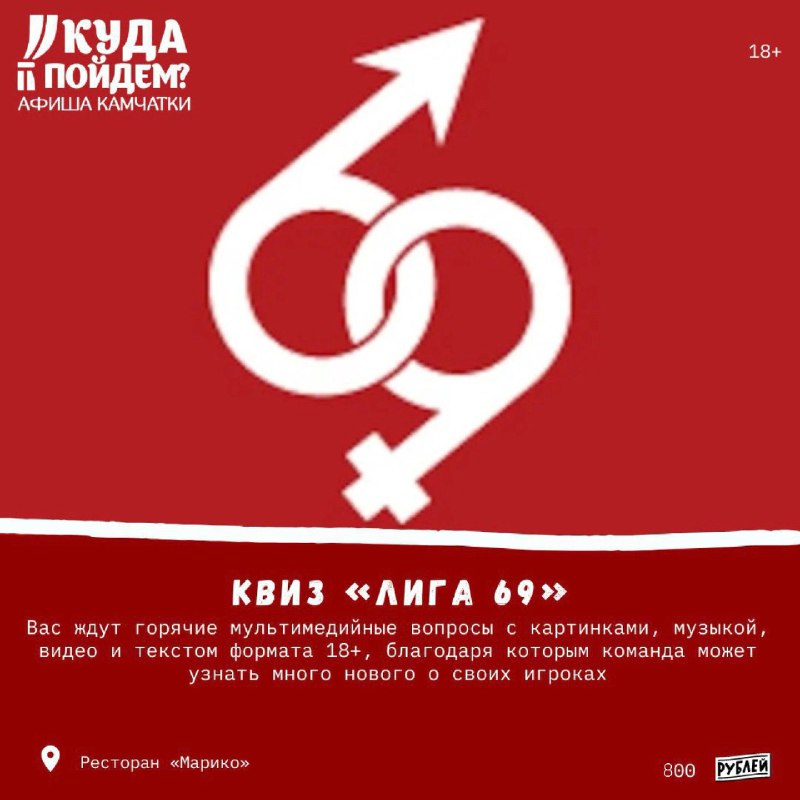 💋Где повеселиться? #8апреля Куда пойдём? Афиша Камчатки сообщает о проведении квиза «Лига 69» (18+) Среда, 8 апреля в 20:00 Ресторан «Марико» (проспект Победы, 67) 800 рублей Регистрация: https://
