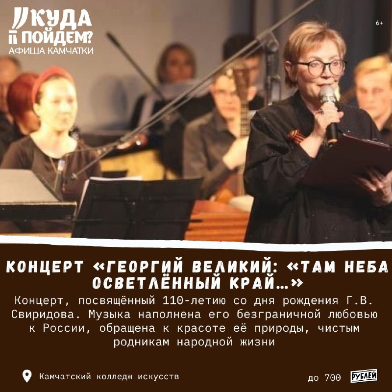 🎼Где музыкальный концерт? #15марта Куда пойдём? Афиша Камчатки сообщает о проведении концерта «Георгий великий: «Там неба осветлённый край…» (6+) Воскресенье, 15 марта в 17:00 Камчатский колледж и