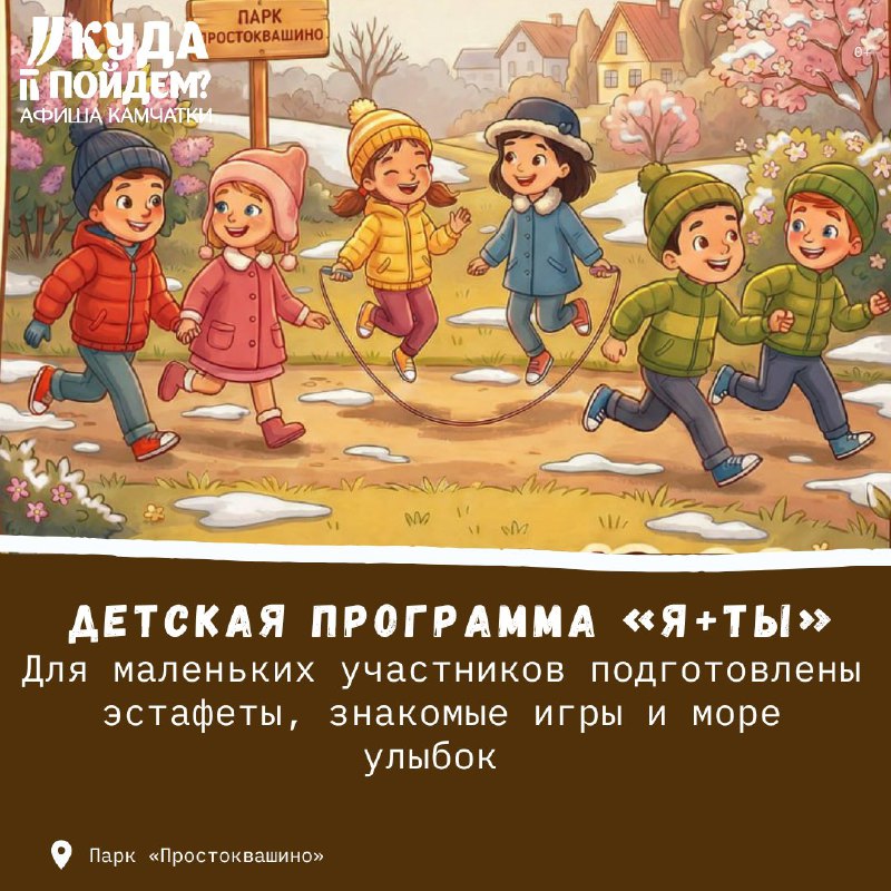 🪁Что для детей? #15марта Куда пойдём? Афиша Камчатки сообщает о проведении детской игровой программы «Я+ТЫ» (0+) Воскресенье, 15 марта в 13:00 Парк «Простоквашино» (Елизово) Вход свободный