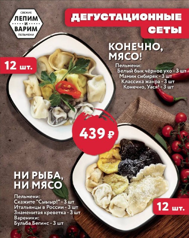 Дегустационные сеты — для тех, кто любит разнообразие в «Лепим и варим» 12 штук разных вкусов в одной тарелке — чтобы найти своего фаворита или просто насладиться всем сразу. 🥟 «Конечно, мясо!» — дл
