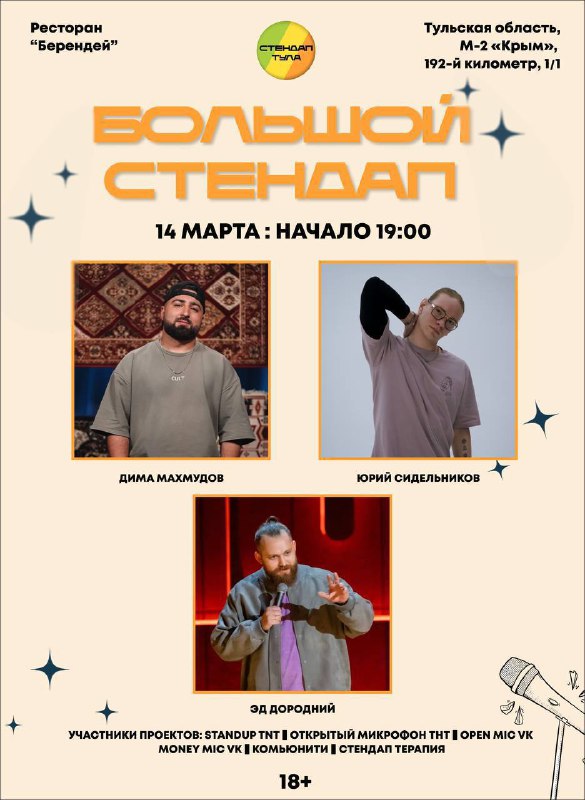 Stand Up Вечер в «Берендее» | 14 марта 14 марта «Берендей» снова превратится в Stand Up клуб, где юмор лечит лучше всяких витаминов. В этот вечер на сцене — три мощных комика со своей правдой жизни