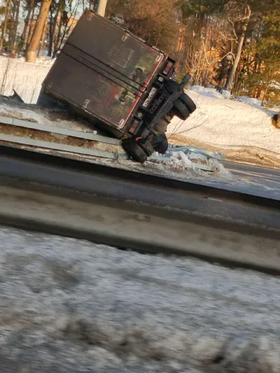 Варшавское шоссе, разворот под мостом у реки Моча лежит на боку. Фото из чата "Подольск пробки, засады, аварии".