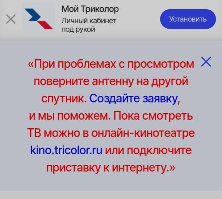 📣О работе спутникового телевидения "Триколор.Сибирь" 📝"Из-за нештатной ситуации на спутнике ТВ-вещание в зоне «Триколор. Сибирь» (56°) сейчас недоступно". Смотреть каналы можно⬇️ 🔹через спутни