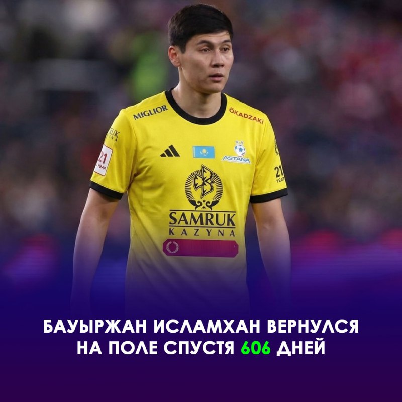 С возвращением! 🤝 😎💪 Бауыржан Исламхан вернулся на поле спустя 606 дней. 💥 Он вышел в старте «Астаны» в матче КПЛ против «Жетысу».