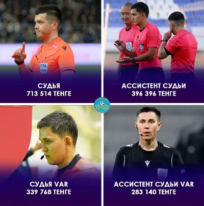 💰 Гонорары арбитров за один матч в КПЛ-2026 💴 Судья - 713 514 тенге 💴 Ассистент судьи - 396 396 тенге 💴 Судья VAR - 339 768 тенге 💴 Ассистент судьи VAR - 283 140 тенге 💴 Оператор VAR - 155 728