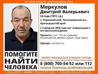 Внимание! #Пропал #Меркулов Дмитрий Валерьевич, 53 года (1972 г.р.) п. #Первомайский, #Ленинградский м.о., #Краснодарский край С 3 февраля 2026 года нет информации о его местонахождении. Приметы: