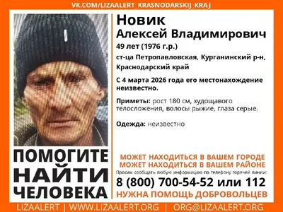 Внимание! #Новик Алексей Владимирович, 49 лет (1976 г.р.) ст-ца #Петропавловская, #Курганинский р-н, #Краснодарский край С 4 марта 2026 года его местонахождение неизвестно. Приметы: рост 180 см,