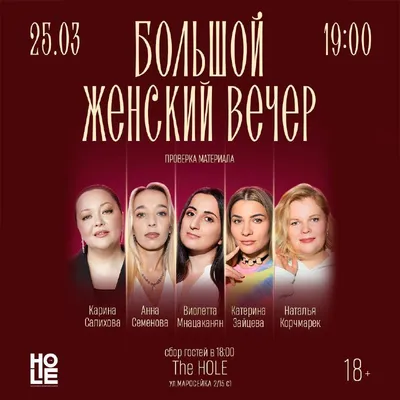 ЗАВТРА В THE H.O.L.E. Большой Женский Вечер 18+ Карина Салихова, Анна Семёнова, Наталья Корчмарек, Виолетта Мнацаканян, Катерина Зайцева Среда 25.03 19:00 → БЕСПЛАТНО Зоя Куулар и Ярослава Тринадца