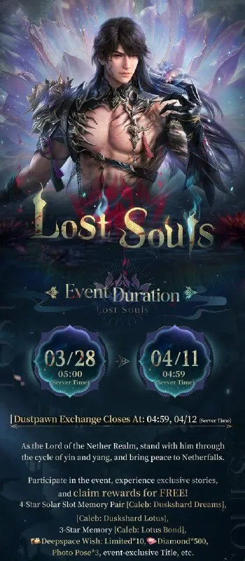 🤩 Эксклюзивный ивент Калеба [Затерянные Души] Будучи лордом Потустороннего мира, пройди с ним через цикл инь и ян и принесите мир в Незерфолл. Участвуйте в мероприятии и получите 4★ солнечные парны