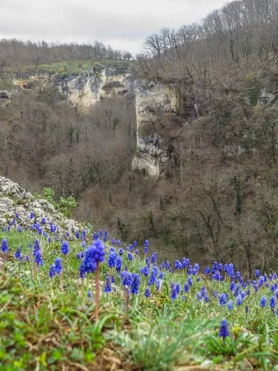 Расплескалась синева. Сегодня специально заехали на скалы ущелья Мишоко, чтобы застать цветение мускари - мышиного гиацинта. Этот нежный и очень ароматный весенний цветок распускается в конце марта -