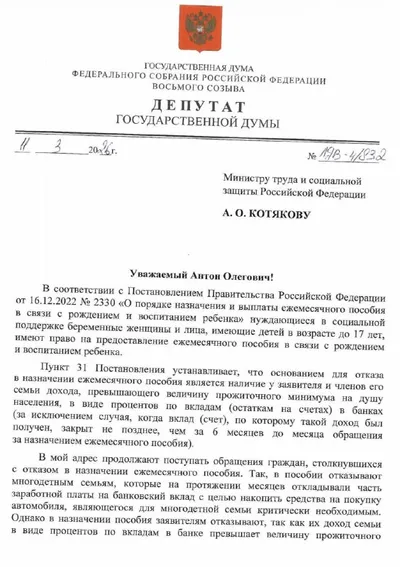 ⚡❗️Доход по вкладам не должен лишать семью господдержки 📩Необходимо увеличить до трех величин прожиточного минимума лимит допустимого дохода по вкладам для получателей пособия, которое выплачиваетс