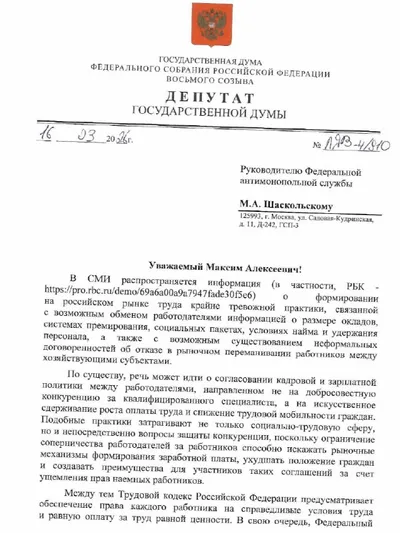 Зарплатный сговор существует? Обратилась в Федеральную антимонопольную службу с просьбой проверить компании на предмет «зарплатного картеля». 🔹В публикации РБК сотрудники компаний заявляют, что в