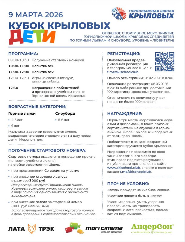 ❄️ Открываем регистрацию на «Кубок Крыловых» ДЕТИ 👧❄️ 📅 Дата соревнований: 9 марта 🏆 Время проявить себя на лыжах и сноуборде! 👉 Регистрация участников по ссылке: https://forms.gle/oCM1o9i