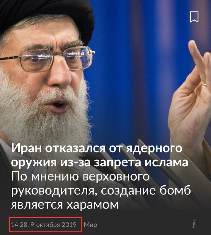 ⚡️Верховный лидер Ирана отказался от ядерного оружия По словам высшего руководителя Али Хаменеи, Иран мог разработать ядерное оружие, но не занимает этим, поскольку это противоречит законам Ислама: