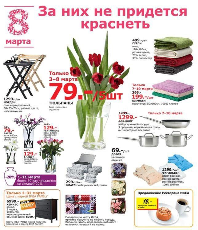 ⚡️«5 тюльпанов за 79 рублей». Акция в IKEA 3-8 марта 2012 года Посетителей магазина также приглашают выпить в ресторане кофе с булочкой за 19 рублей. 🕰 Позже всех. Ну прости