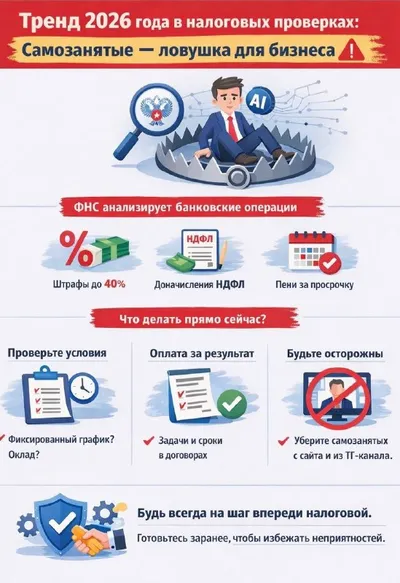 🚨 Тренд 2026 года в налоговых проверках: самозанятые - ловушка для бизнеса 🚨 Если вы используете самозанятых, то нужно быть готовым к повышенному вниманию со стороны налоговой. Самозанятые - это не